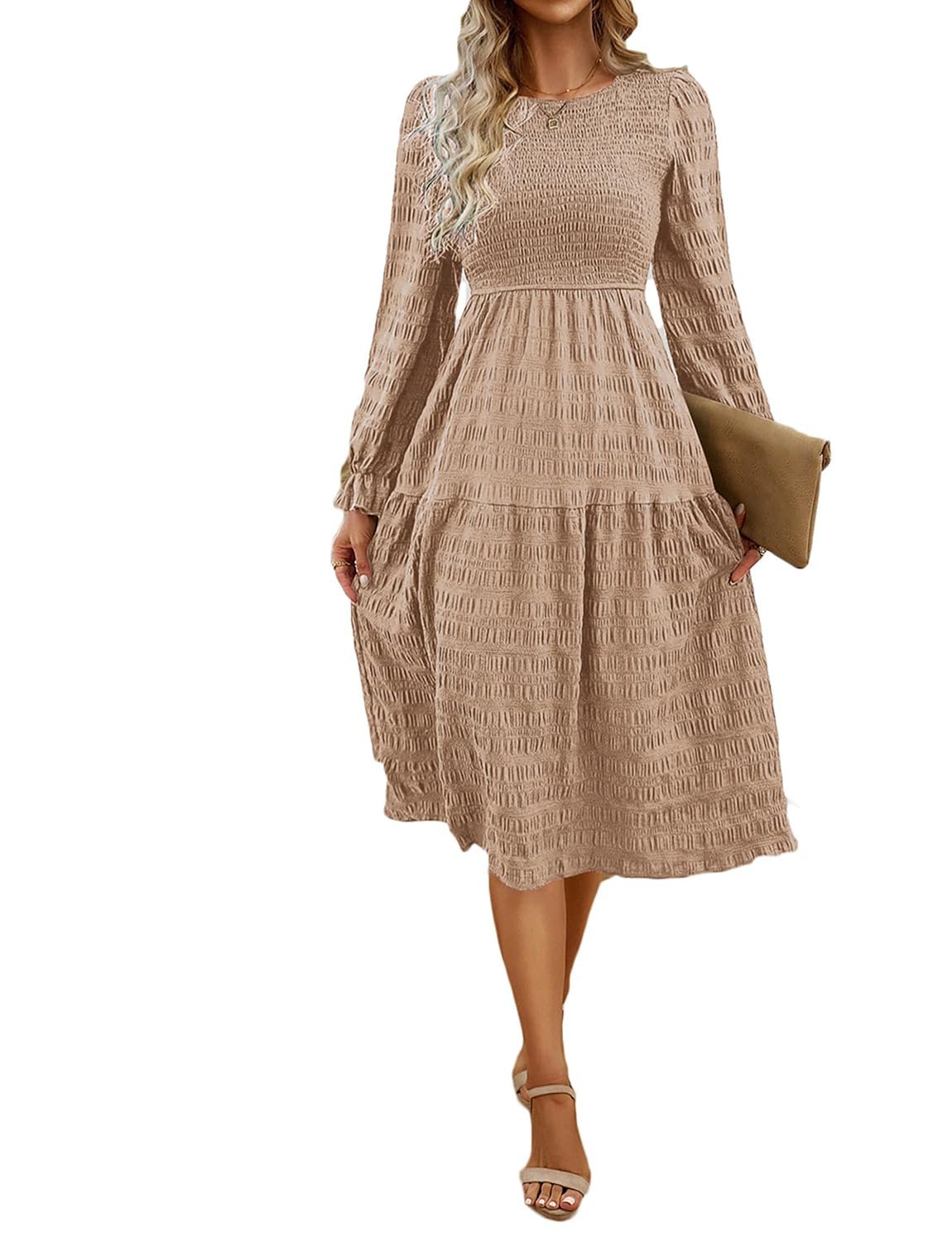 VECVOC Women’s Fall Boho Long Sleeve Dresses Causal Smocked High Waist A Line Midi Dress,Khaki,Small