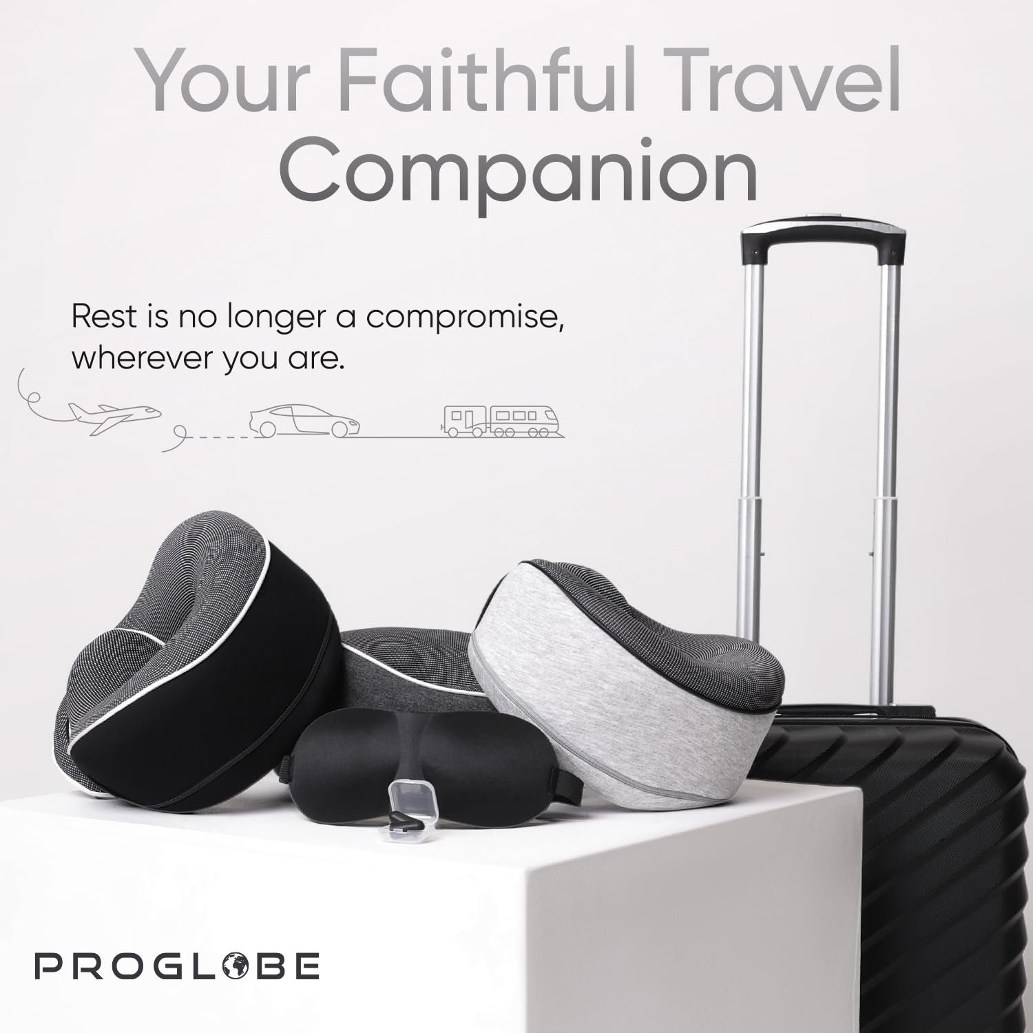 Proglobe Orthopedic Neck Pillow Travel Neck Pillows for Airplanes, Memory Foam Kit, Updated Resting Material, Airplane Travel Set with 3D Contoured Eye Masks, Earplugs, and Luxury Mesh Bag (Grey)
