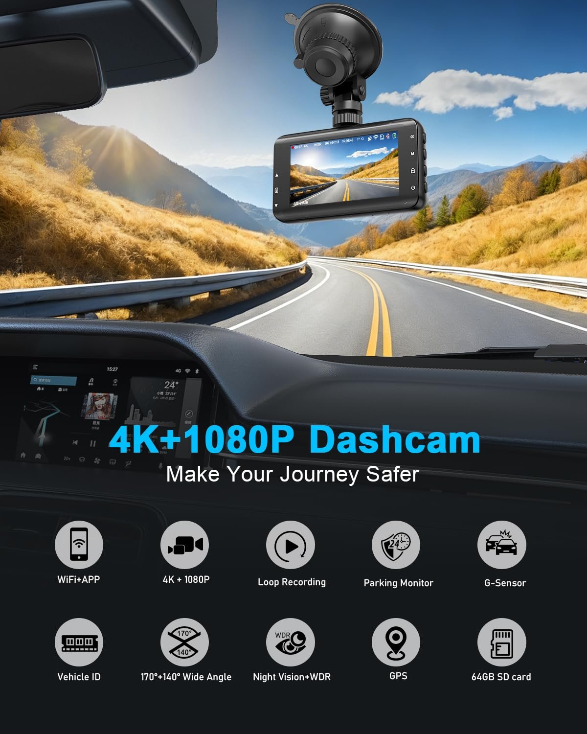 Review 4K Dash Cam Front and Rear Camera,Free 64GB SD Card, 4K+1080P Dual Dashcams for Cars, 5G WiFi & App Control, 3.0″ IPS Car Camera, Night Vision, 24H Parking Mode, G-Sensor, Loop Recording.