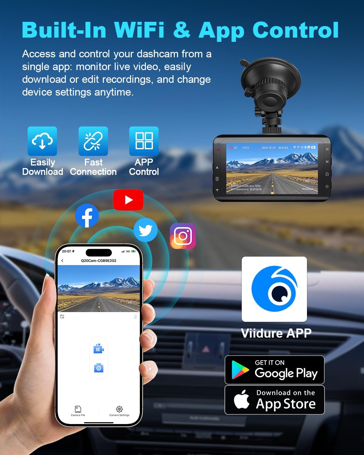 - 【Built-in Wi-Fi & Parking Reverse Assist】Via built-in Wi-Fi, this car camera dash cam front and rear connects to the “Viidure” app on your smartphone, allowing you to easily view, manage, and share videos and photos recorded by the dashcam. The dash camera also features a parking reverse assist function, enhancing safety and providing reliable support during tricky parking maneuvers.