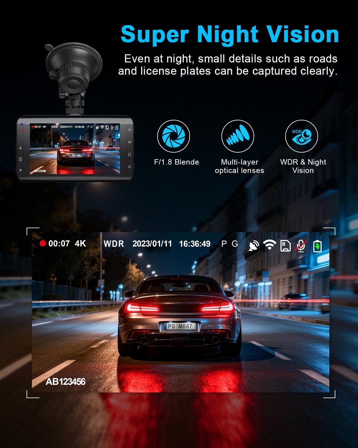 - 【24H Parking Monitoring & Super Night Vision】Equipped with advanced WDR technology, this car dash cam automatically adjusts exposure to optimize low-light recording, ensuring clear and visible footage at night. The dashcams for cars automatically activates Parking Mode when the vehicle is parked, safeguarding against theft or vandalism with minimal power consumption. (Hardwire kit required for parking mode, not included.)