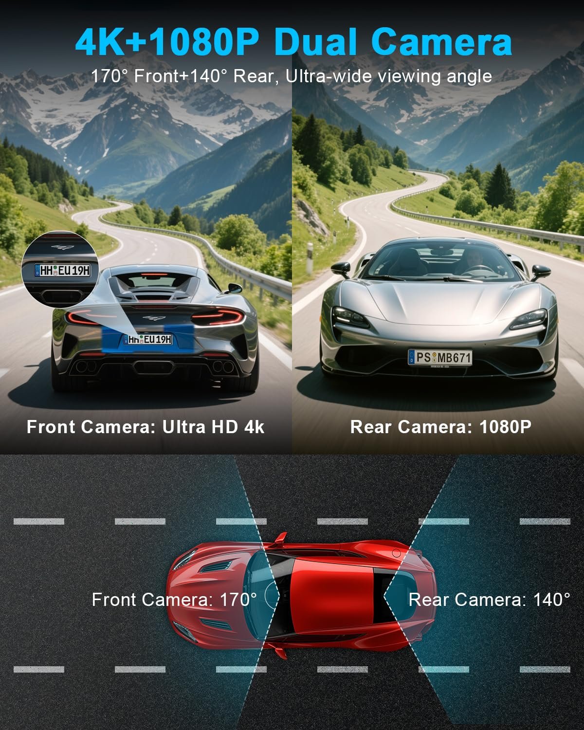- 【4K+1080P Dual Recording & Ultra-Wide Angle】This dash cam front and rear camera features a 4K Ultra HD front car camera and a 1080P rear car camera, capturing key details like road signs and license plates with clarity to provide high-quality evidence. The front and rear dash cam’s 170°/140° ultra-wide-angle lens covers approximately 6 lanes, effectively eliminating blind spots and delivering all-around driving monitoring and safety protection as a reliable dashcam.