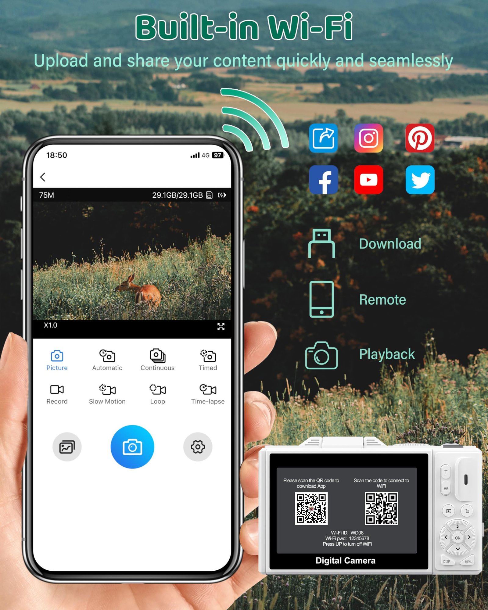 • 📡【Wireless WIFI & Webcam/Vlogging Function】The upgraded camera for YouTube features a built-in wireless Wi-Fi function, allowing you to instantly share videos and photos online via your cell phone. This vlog camera can also be used as a webcam for live streaming, video calls, and blogging, making it easy to stream or make video calls on YouTube, Facebook, Twitter, or other social media platforms.