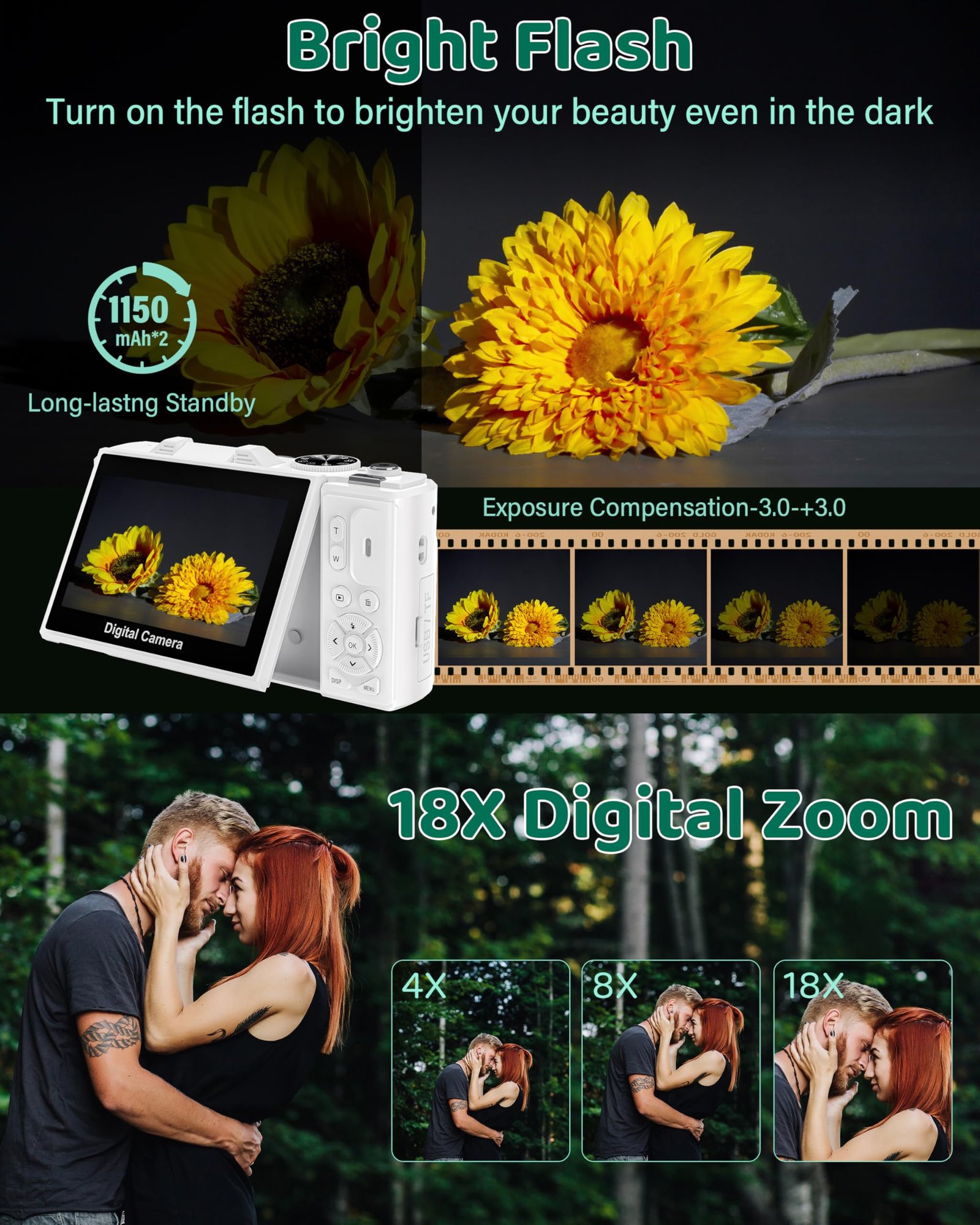 • 🔍【Autofocus & 18X Digital Zoom Camera】This photography camera boasts a robust 18x digital zoom, allowing you to capture distant objects with ease. The autofocus feature ensures your shots are always sharp, so you can effortlessly capture perfect moments. The vlogging camera also features a 3.0-inch IPS 180° flip HD screen, making it perfect for snapping selfies from any angle.