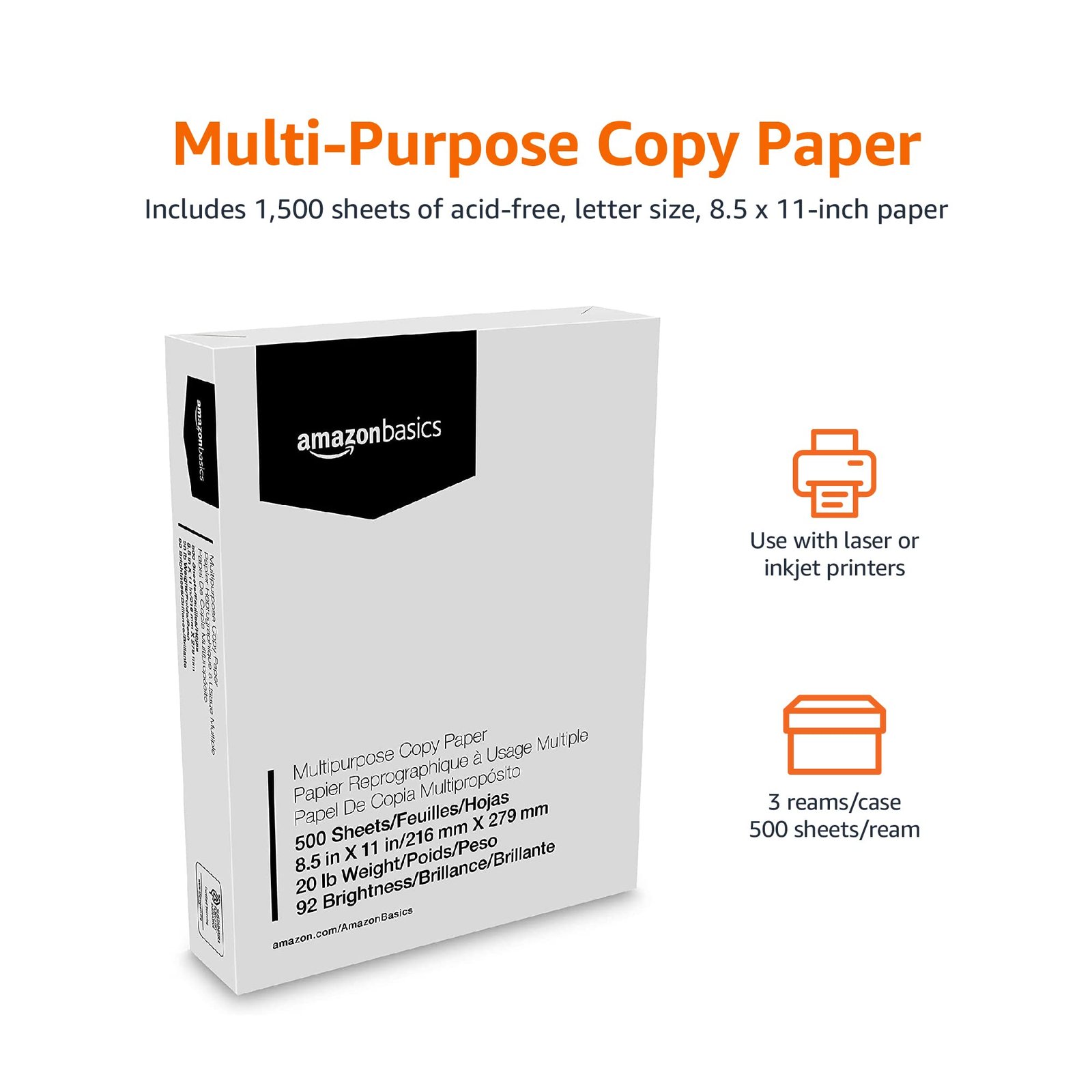 Review Amazon Basics Multipurpose Copy Printer Paper, 8.5″ x 11″, 20 lb, 3 Reams, 1500 Sheets, 92 Bright, White.