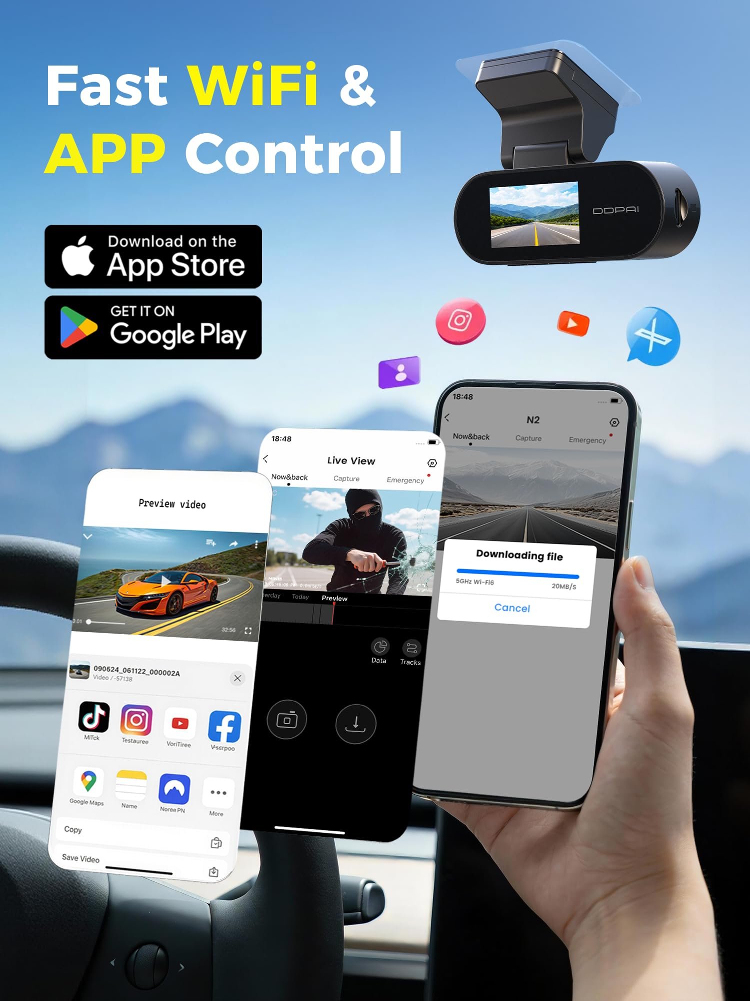- Loop Recording and Emergency Lock: The N2 Dual dashcam ensures continuous recording even when the memory card is low on space. When the memory card reaches its capacity limit, the dashcam automatically deletes old files to make room for new video recordings. Additionally, the G-sensor automatically locks the current video file in the event of a sudden impact or collision to prevent overwriting. (TF card not included; maximum support 256GB).