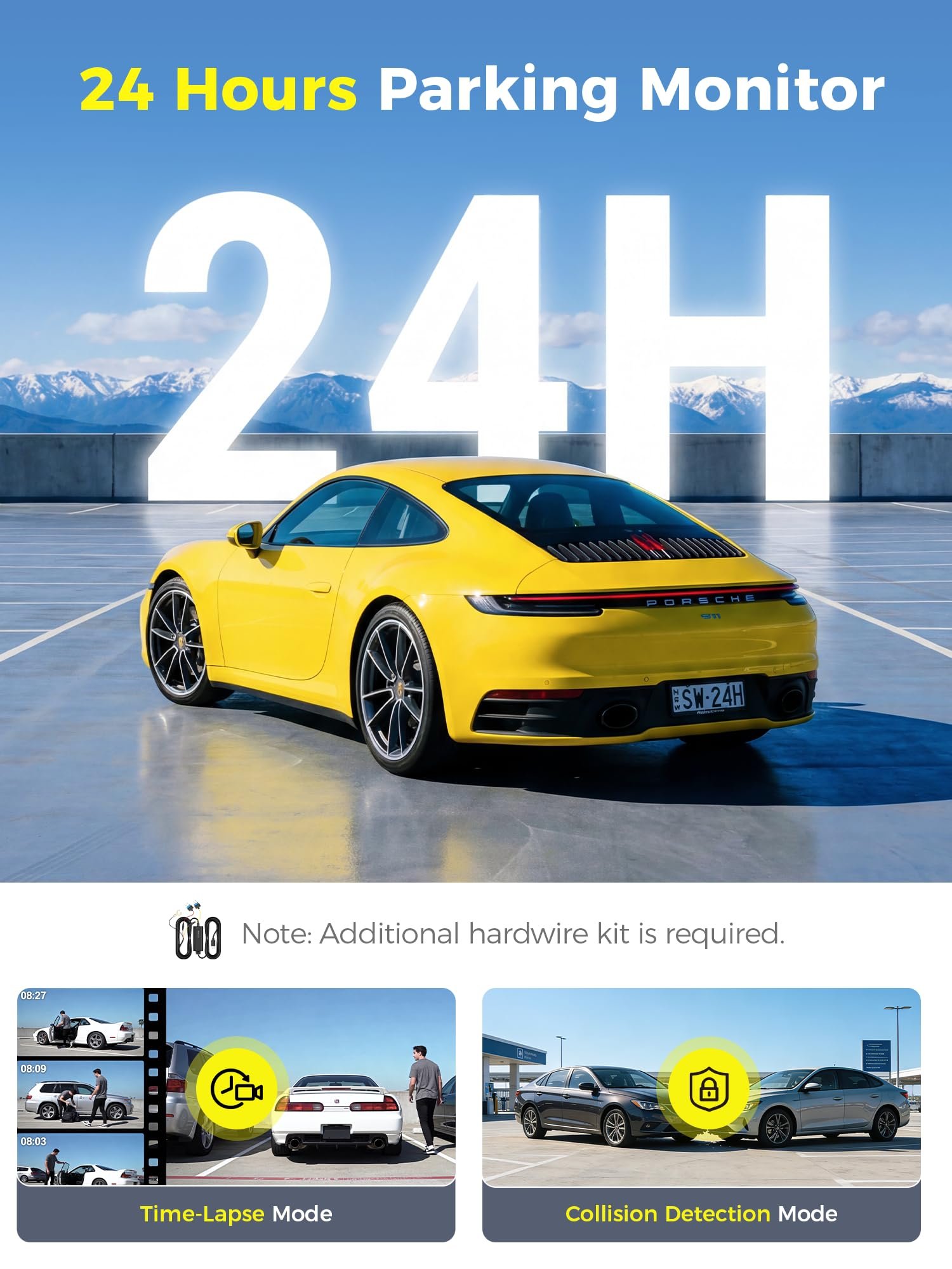 - 24-Hour Parking Monitoring Dash Cam: The ddpai N2 Dual dash cam front and rear automatically wakes up and starts recording when it detects a sudden vibration or impact while the vehicle is stationary. For your peace of mind while parking, the dash cam will notify you with a voice alarm upon restarting. (Parking monitoring mode requires an optional hard-wired kit (ASIN: B0DP639X2D/ B0DP6464P3), sold separately.)