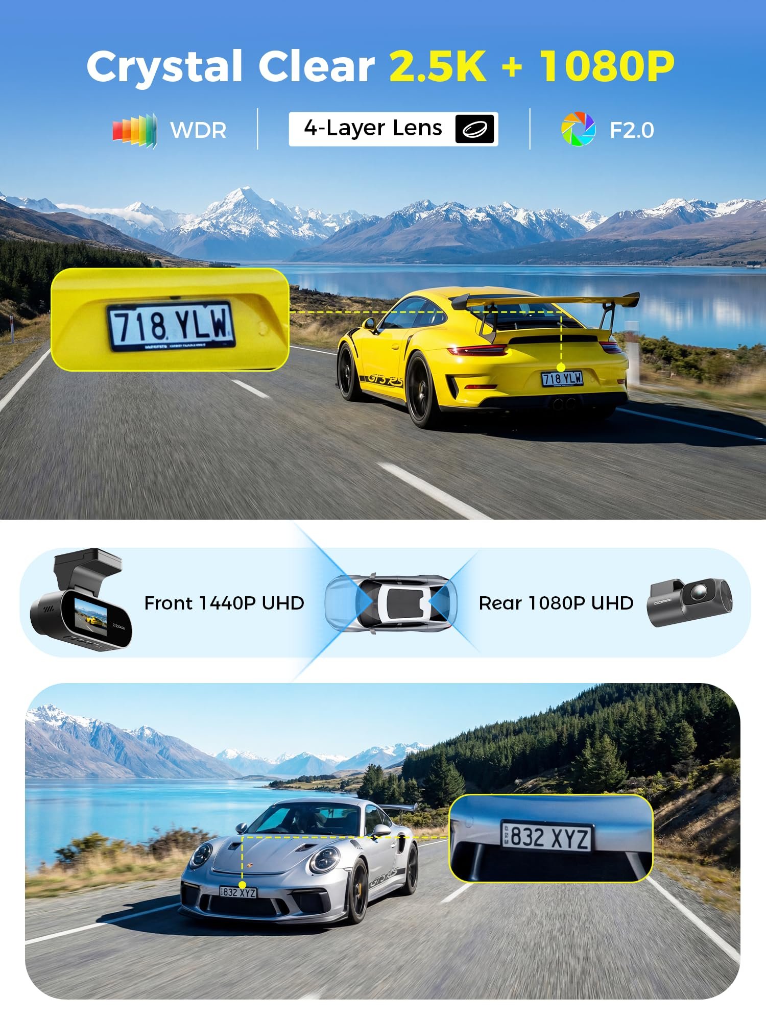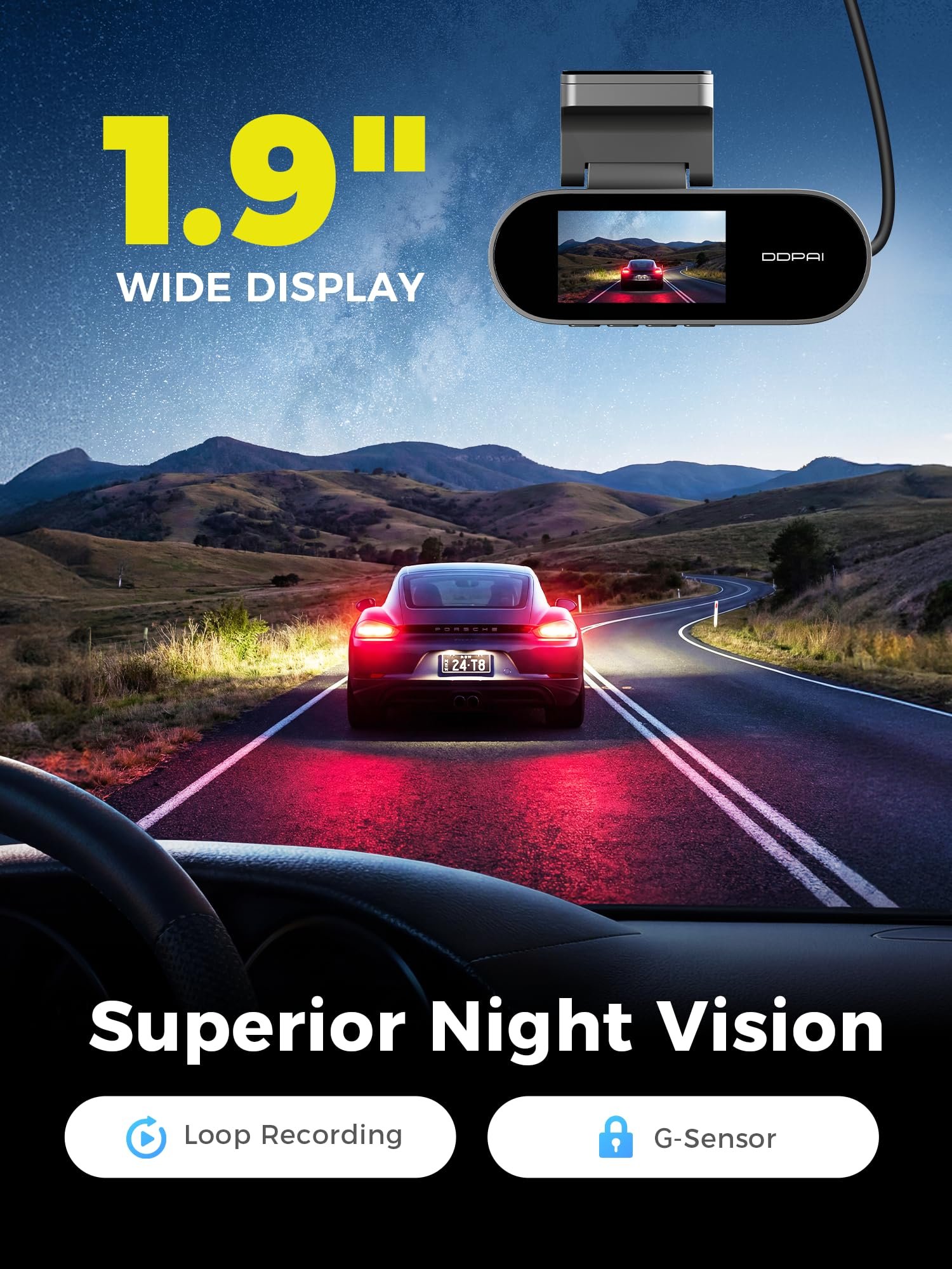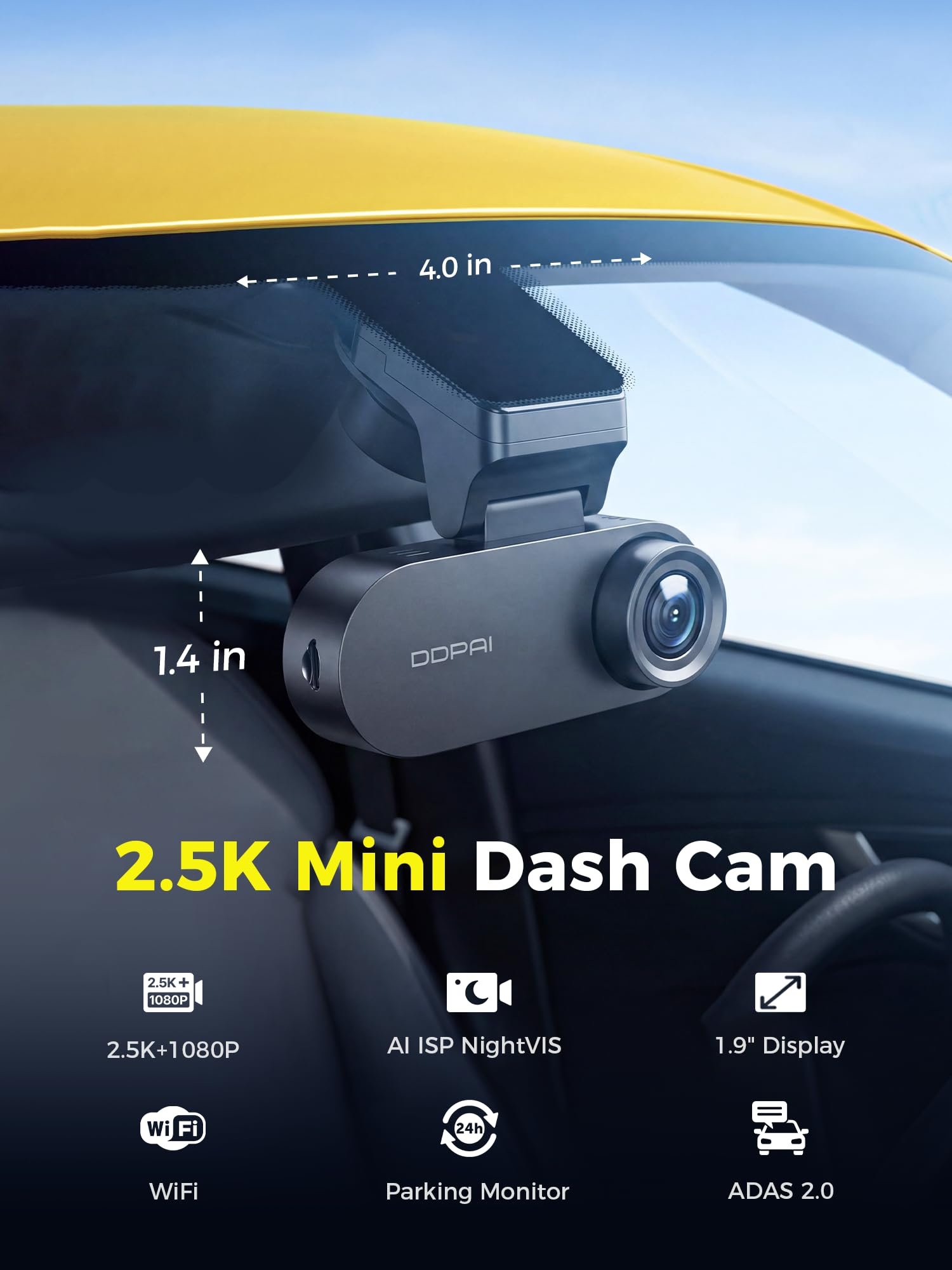 - 2.5K+1080P Dash cam: The ddpai N2 Dual dash cam features a front camera that supports 2.5K recording and a rear camera that supports 1080P recording. Please remove the lens protective film before use to avoid blurry videos. The 1.9-inch screen allows you to view the recording status and video feed in real time.