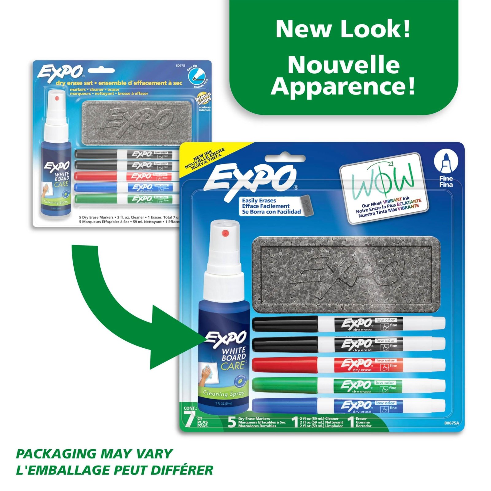 Details: Bright, vivid, non-toxic ink is quick-drying, smear-proof, easy to see from a distance, and provides consistent color quality. Durable, fine point tip for thin, detailed lines. Erases cleanly and easily with a dry cloth or Expo eraser. Ink is specially formulated to be low-odor. Perfect for use in classrooms, small offices, and homes. Made in the USA Expo 2 Low-Odor Dry Erase Set, Fine Point, 7-Piece with Cleaner, Assorted Colors.