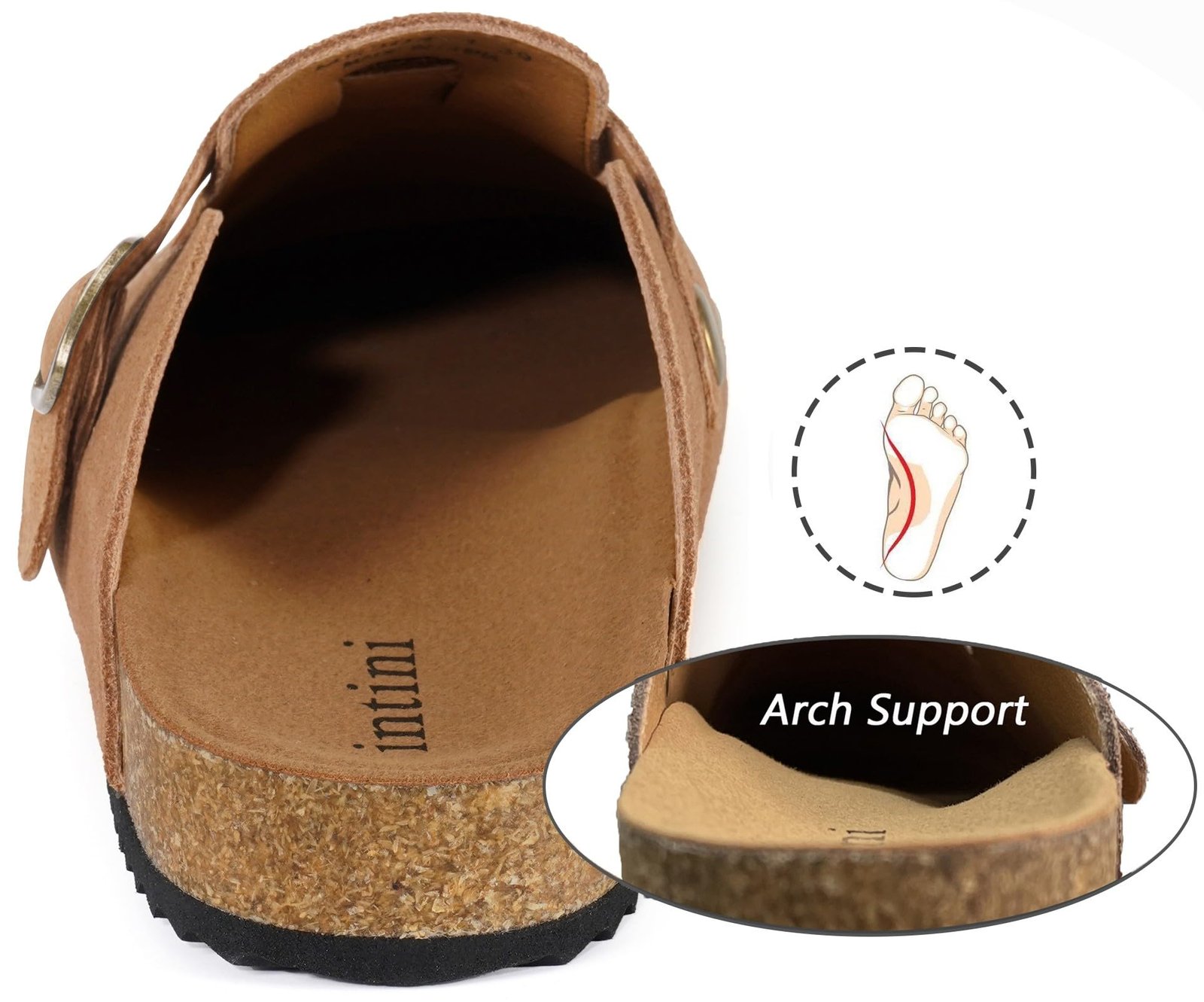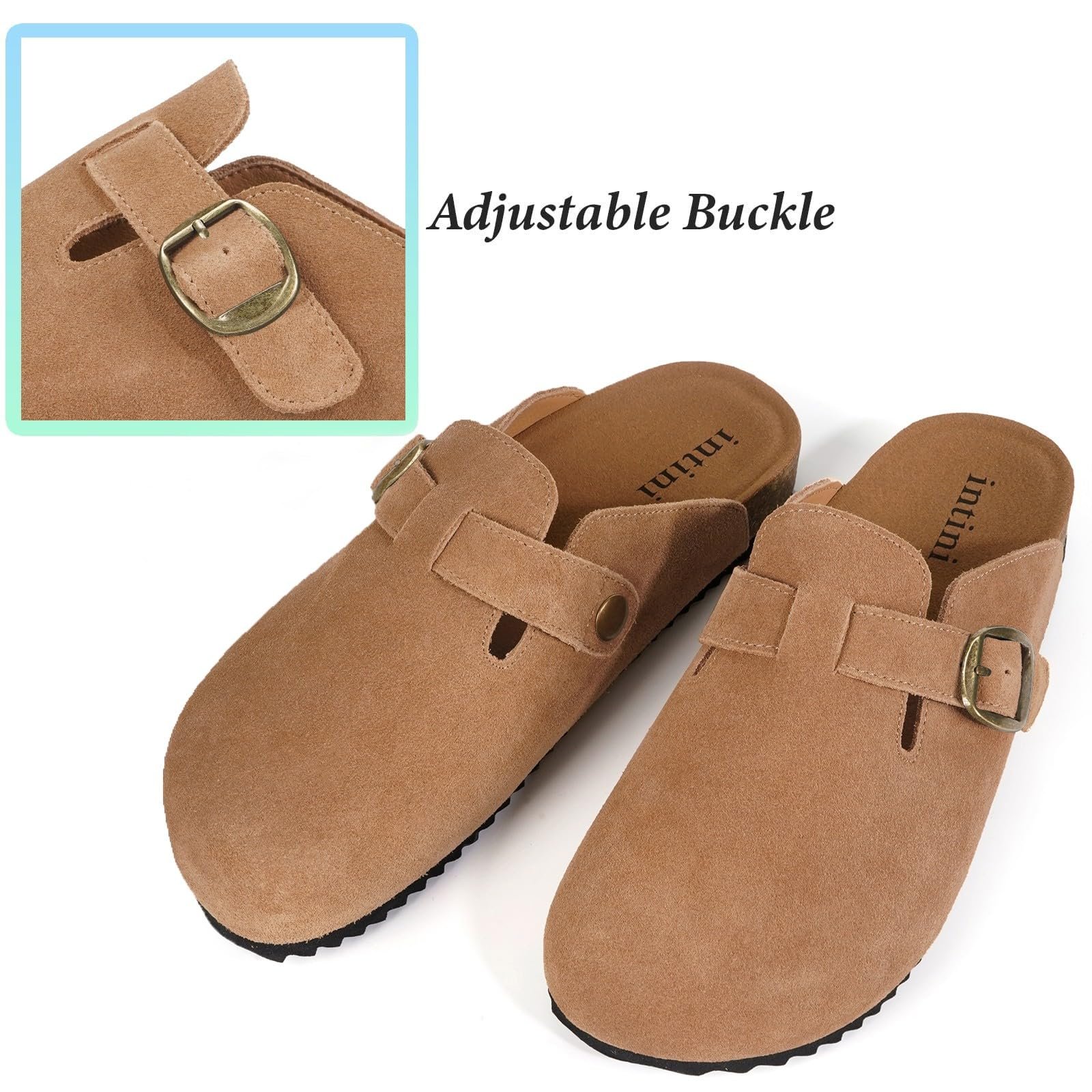 Review Intini Suede Leather for Men Womens Adjustable Buckle Cork Footbed Non-Slip Slippers Home Sandals Light Brown.