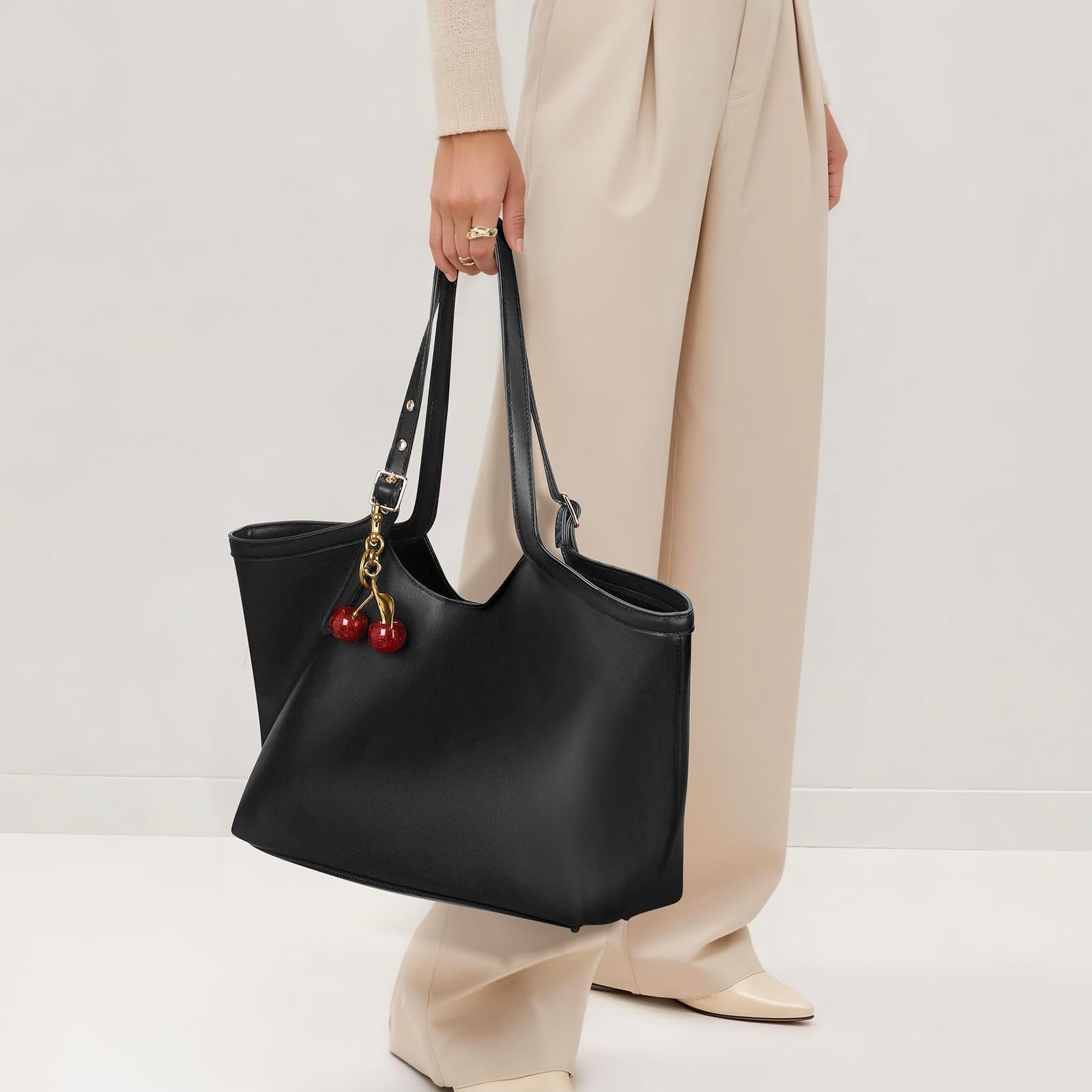 JQWSVE Faux Leather Tote Bags for Women Cherry Shoulder Handbag Large Capacity Work Tote Bag Weekender Bag Shopper Handbag, Black, Large