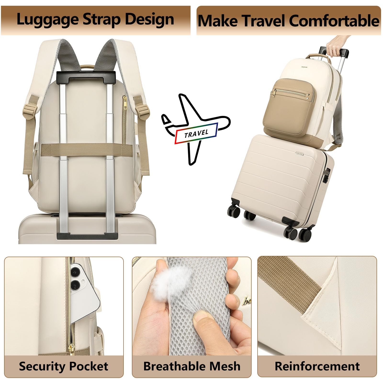 - 【Convenient Travel Backpack with Luggage Strap】- Luggage strap on back of the computer backpacks allows backpack fit on luggage/suitcase, freeing your hands on a business trip. Waterproof travel laptop backpack fits under the seat also meets airline carry-on requirements. Adjustable shoulder strap design with mesh fabric for breath ability, it can distribute the weight of airport backpack decently on our back pack, providing you with more comfort during your trip.