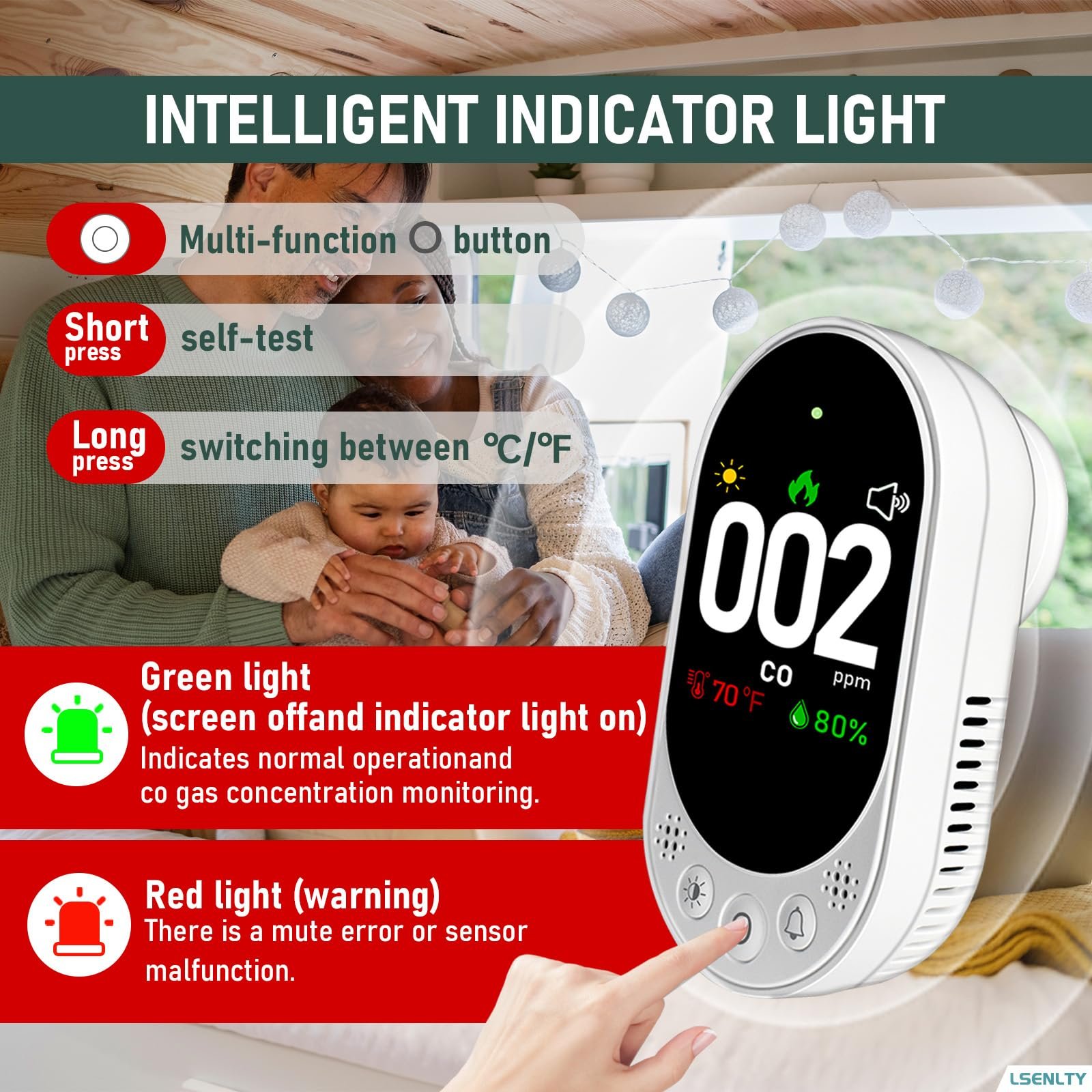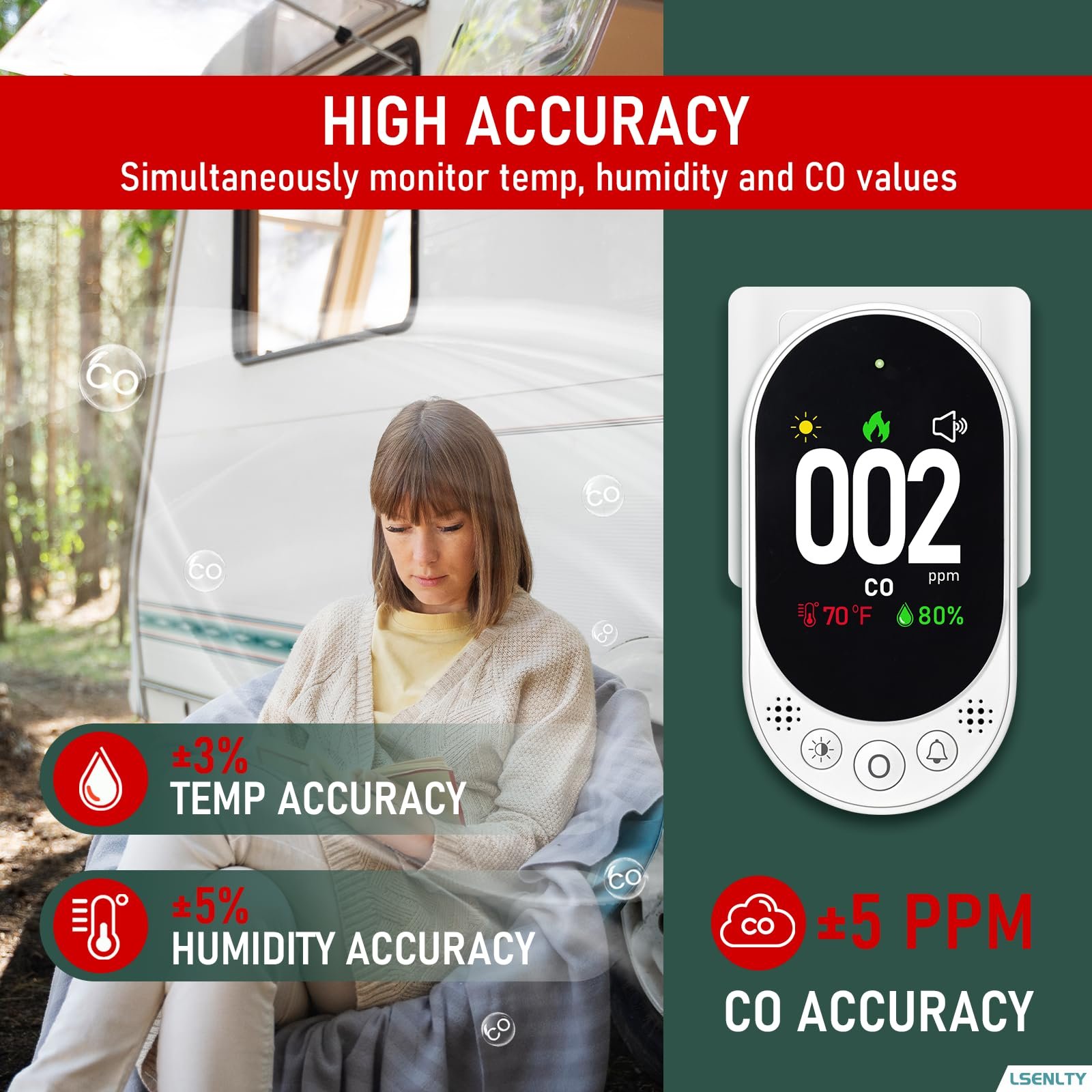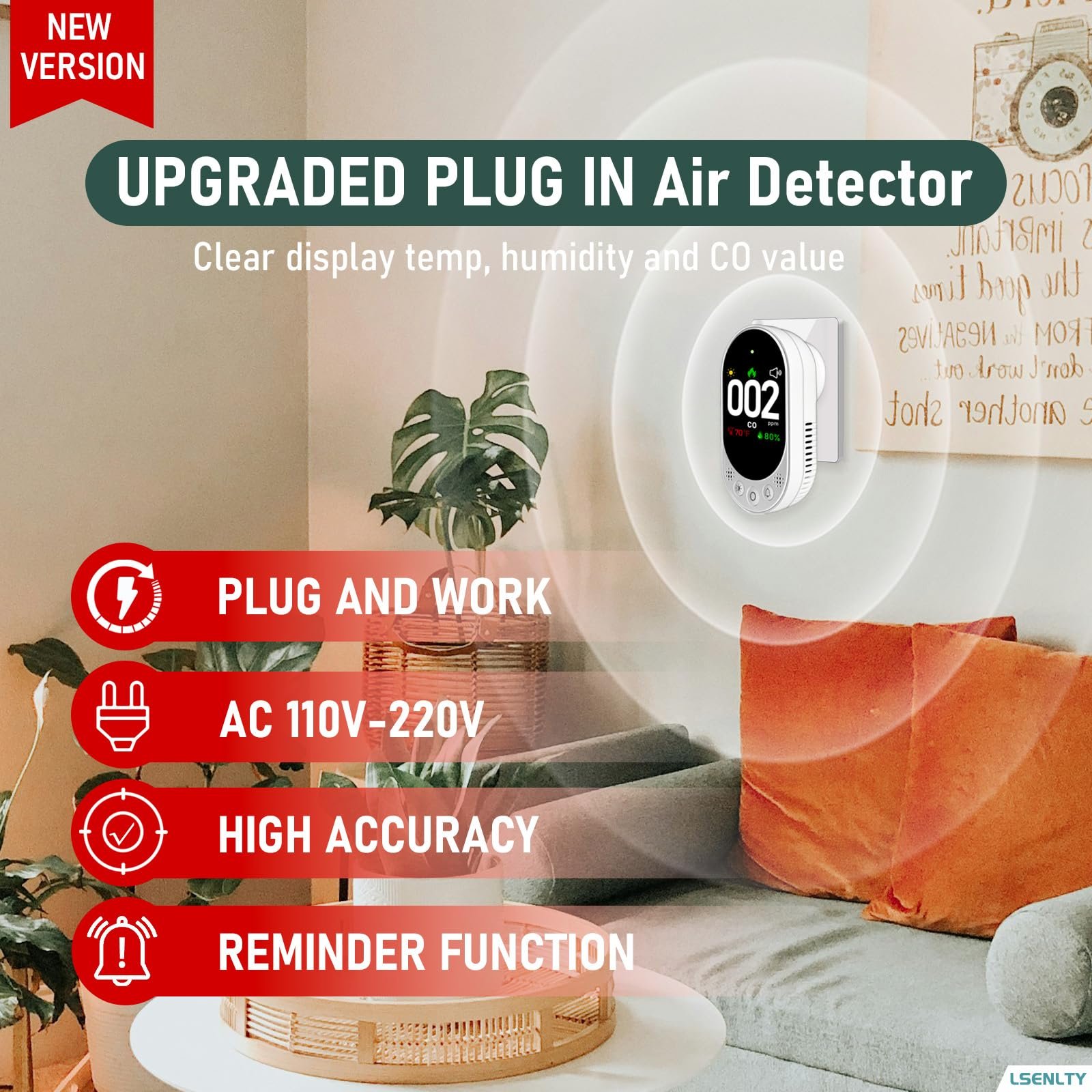 LSENLTY Carbon Monoxide Detector Plug in, Check CO, Temp and Humidity, HD Screen&Indicator Visual&Audible Alert for Home RV Camping