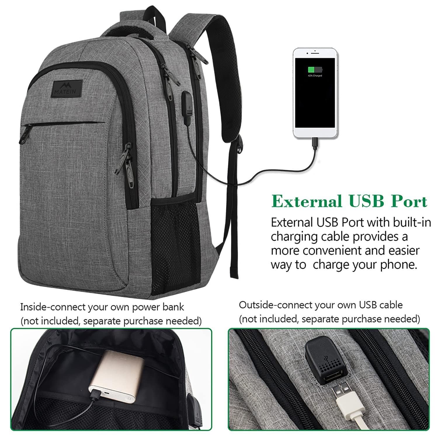 • USB PORT DESIGN: With built in USB charger outside and built in charging cable inside,this usb backpack offers you a more convenient way to charge your phone while walking. It’s a great tech gift for him from wife, daughter and son. Please noted that this backpack doesn’t power itself, usb charging port only offers an easy access to charge