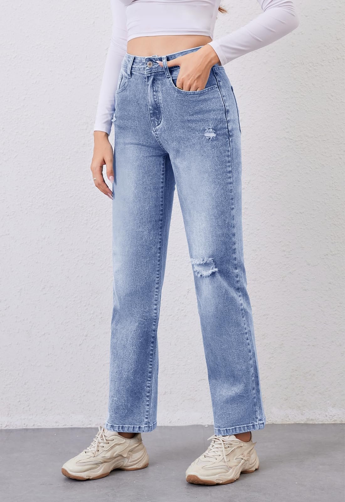 • Design:These ripped stright leg jeans for women hug your curves for a perfect fit, highlight your silhouette and keep you chic. The straight leg silhouette creates a flattering and versatile fit, suitable for various body types