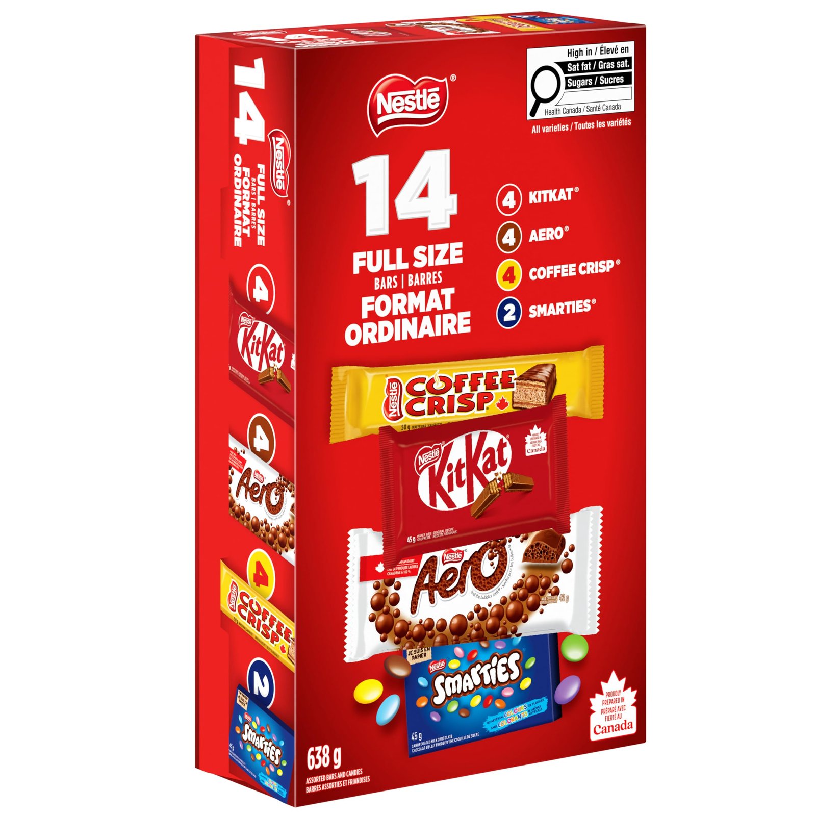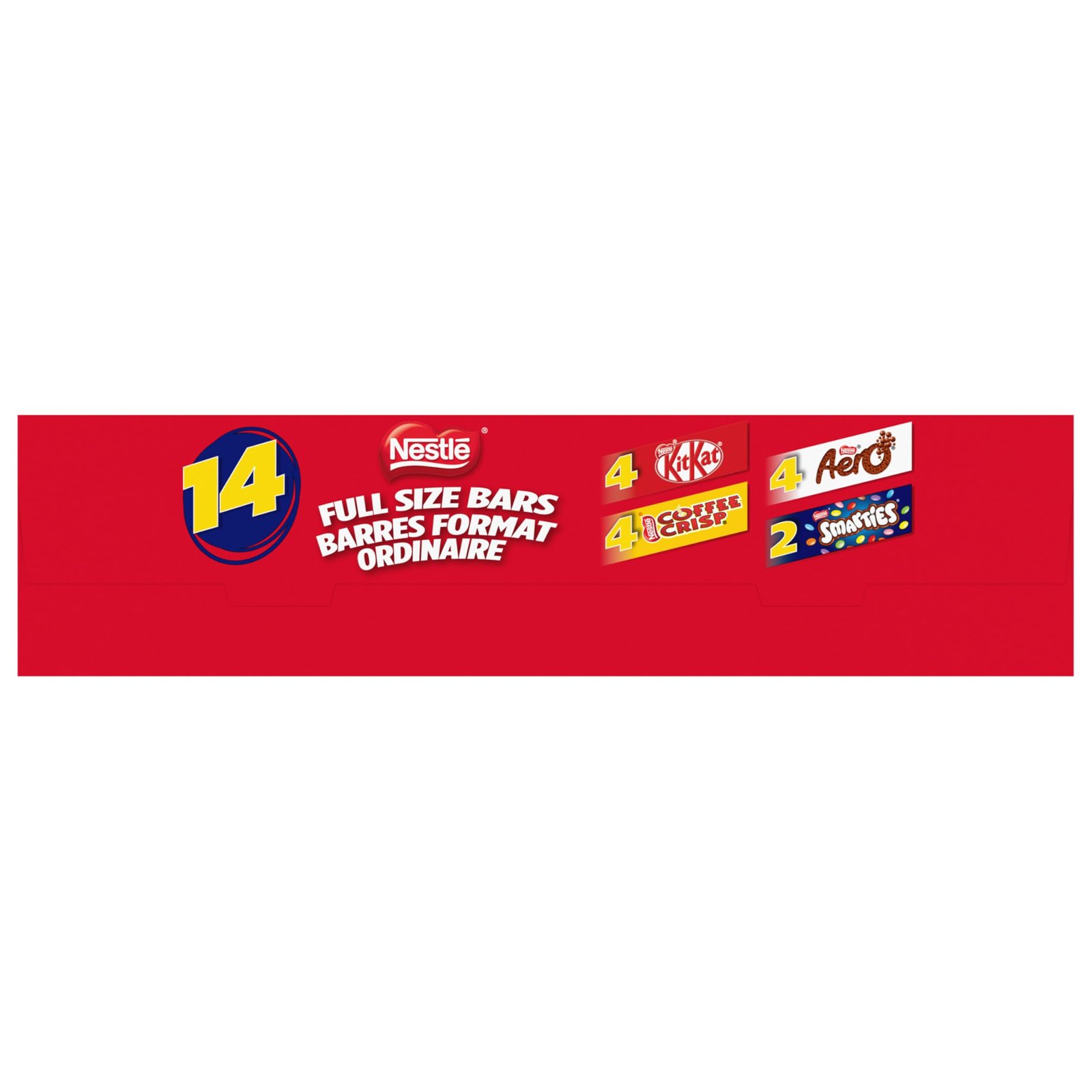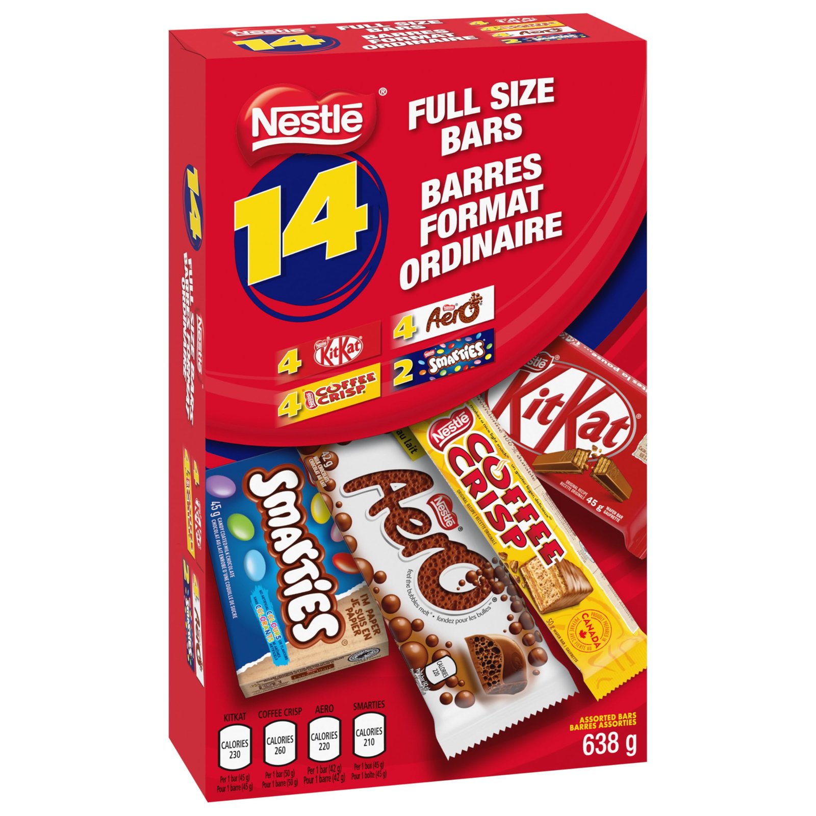 Details: Master snack time, party time and holidays with Nestlé Favourites 14-pack assorted chocolates (pack of 14). All your favourite Nestlé chocolate bars in one multipack. Complete with Kitkat, Coffee crisp, Aero and Smarties.