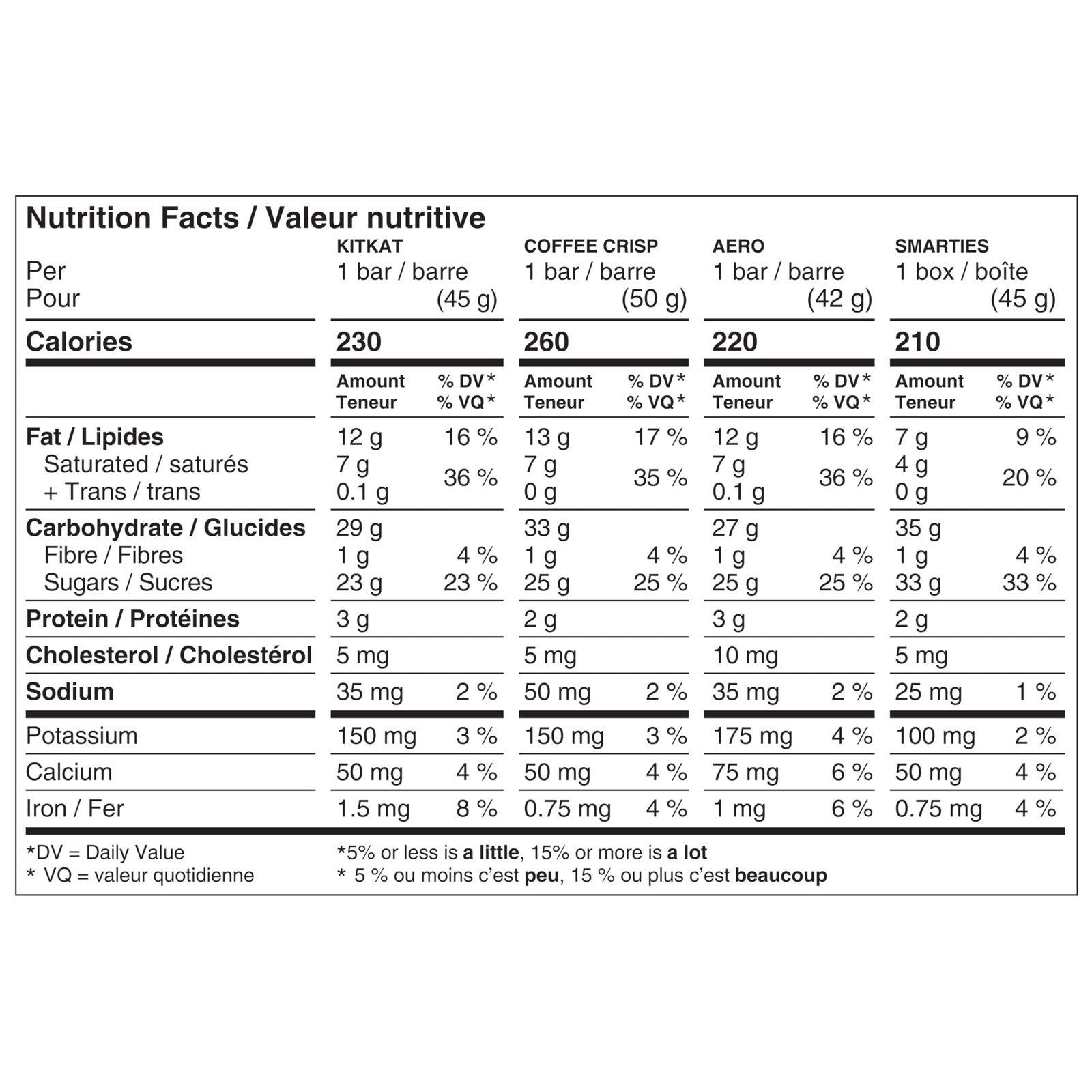 - Individually wrapped bars including Kitkat, Coffee crisp, Aero and Smarties