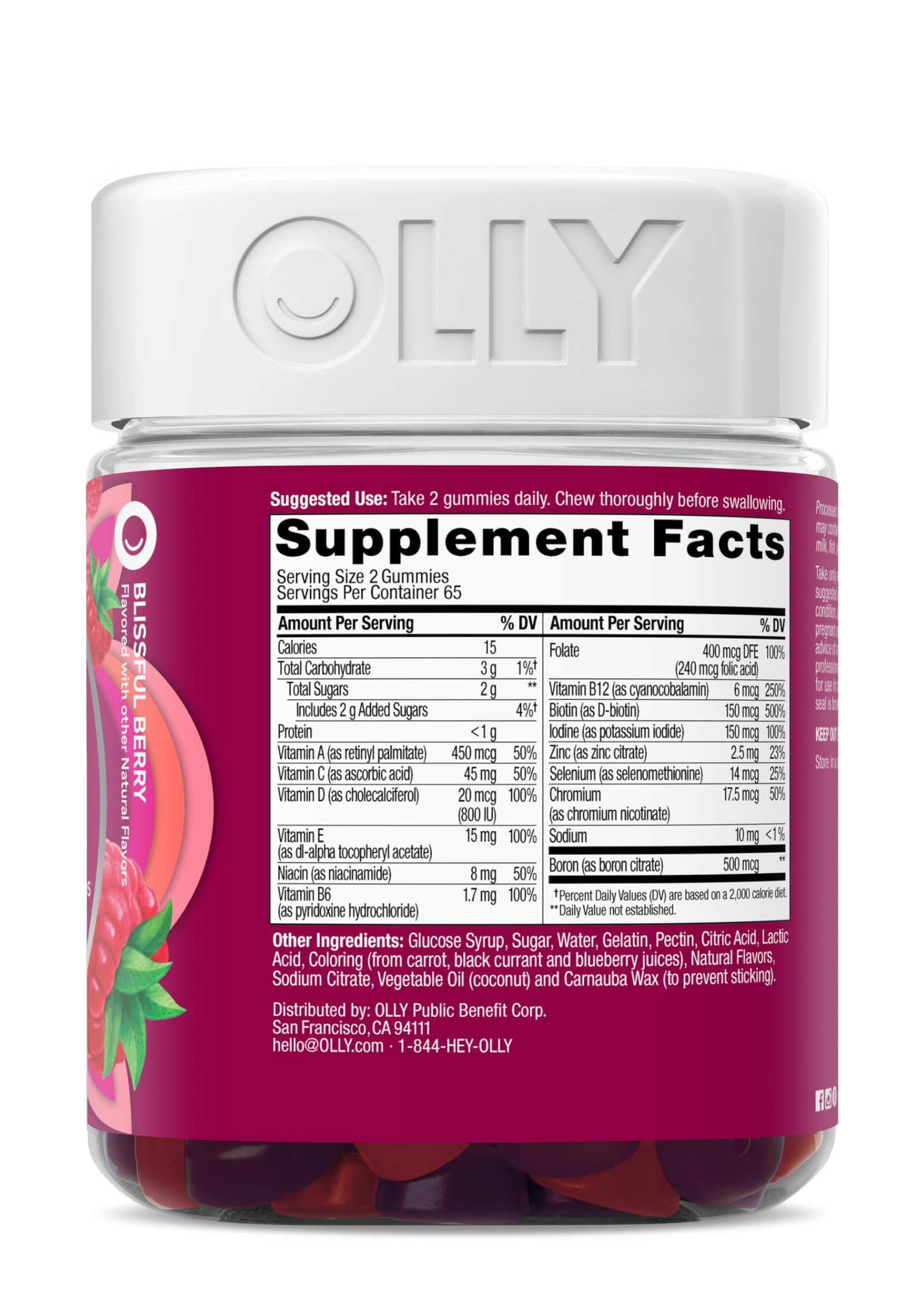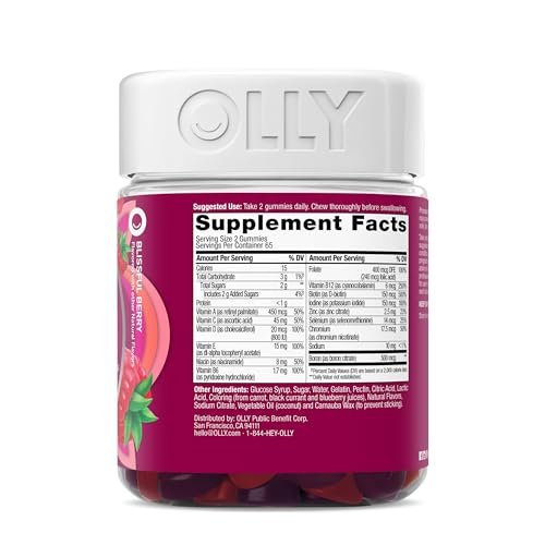 Details: Go big with OLLY Women’s Multi gummies, a delicious, scientifically formulated, gluten free gummy vitamin for health and wellness. Our Blissful Berry flavor with other natural flavors gummy vitamins for women include nutrients to nourish you daily so you can keep doing your thing. This womens multivitamin blend features B Vitamins to support cellular energy, Vitamin D to support bone health* and Vitamins A, C & E. The chewable daily vitamins are a blend for overall wellness and to help fill the gaps when your eating habits are a little less than perfect.* We’ve made it our mission to champion better wellbeing, for all. We do it by crafting products that are as effective as they are delicious—because we know when something feels good, you’re more likely to do it.* *These statements have not been evaluated by the Food and Drug Administration. This product is not intended to diagnose, treat, cure or prevent any disease.