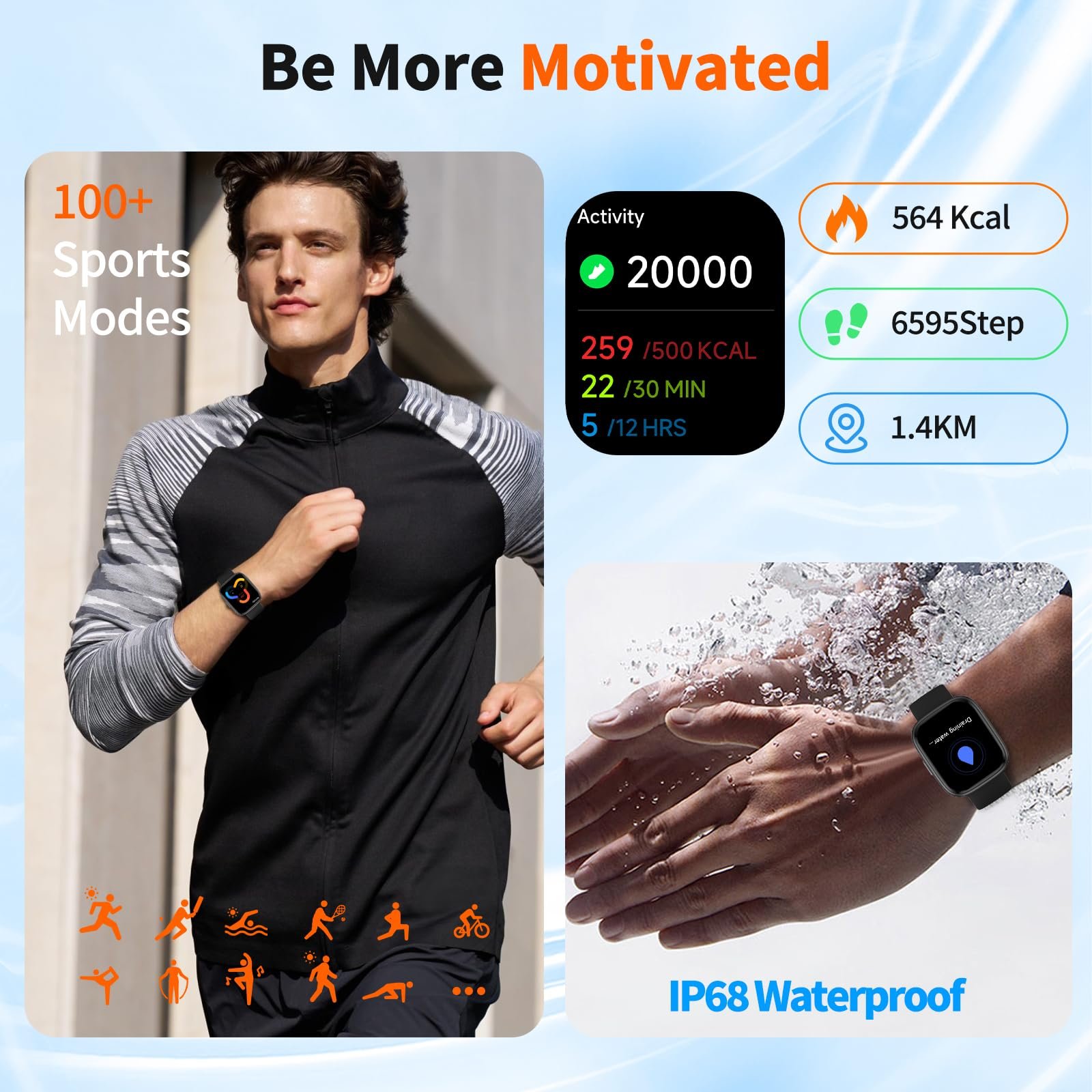 - 【100+ Sports Modes & IP68 Waterproof】 Whether it’s running, yoga, cycling, or swimming, choose from 100+ sport modes to monitor your workouts with real-time data. With an IP68 waterproof rating, the watch easily withstands sweat, rain, and splashes—ready for every fitness challenge.