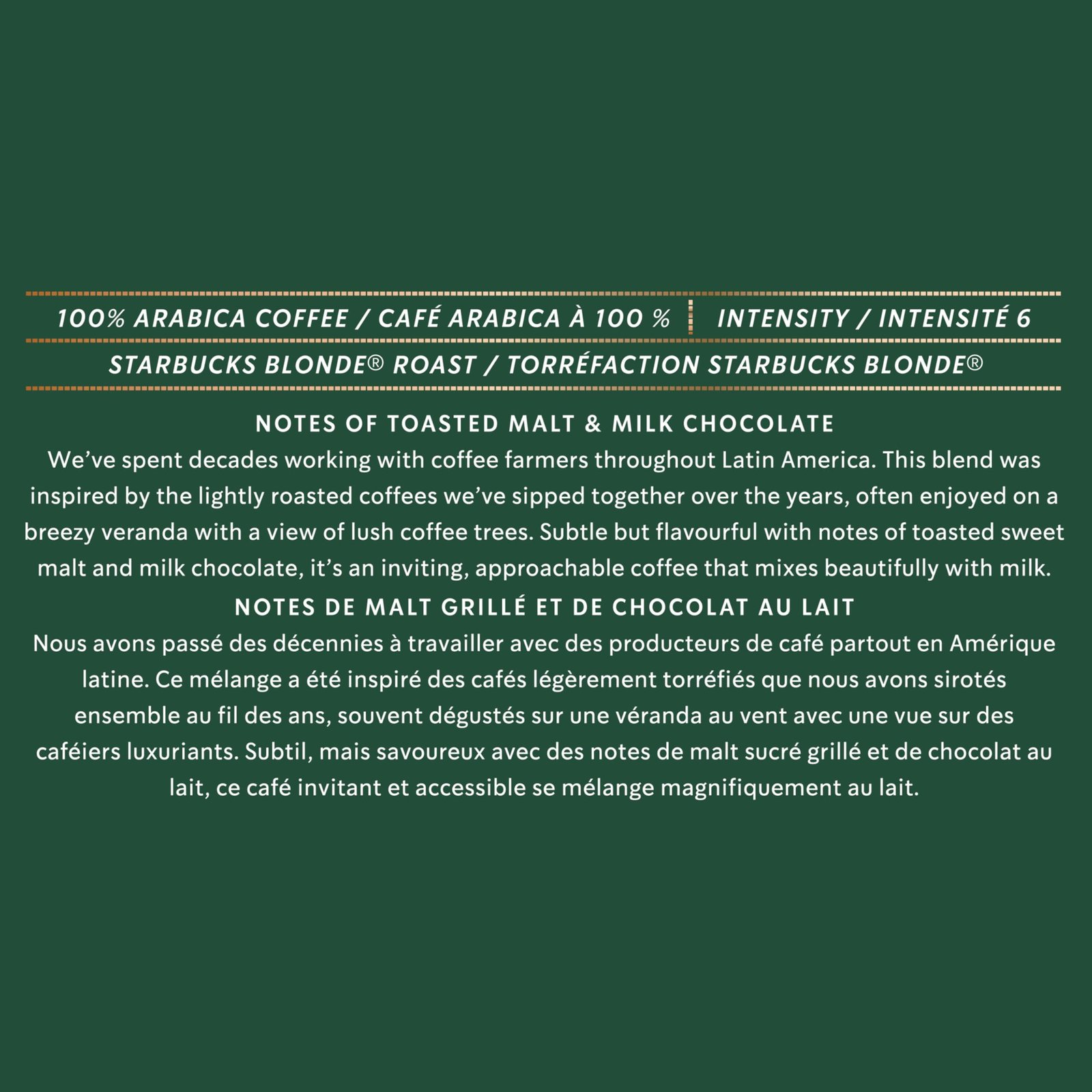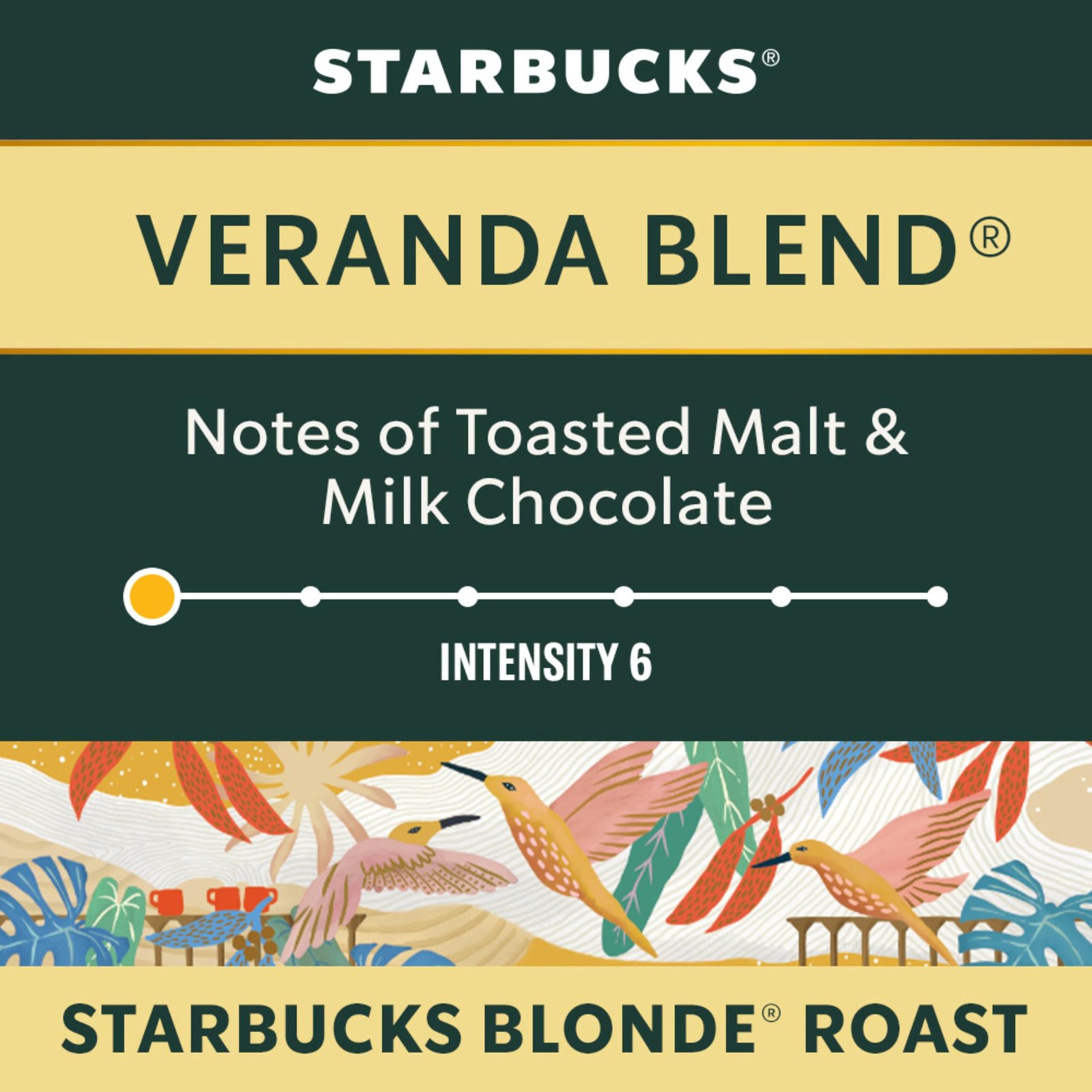 - Inspired Tastes: STARBUCKS VERANDA BLEND for NESPRESSO VERTUO is a blonde roast coffee that has a profile level intensity of 6 with mellow and soft notes; It is made with a blend of Latin American coffee beans