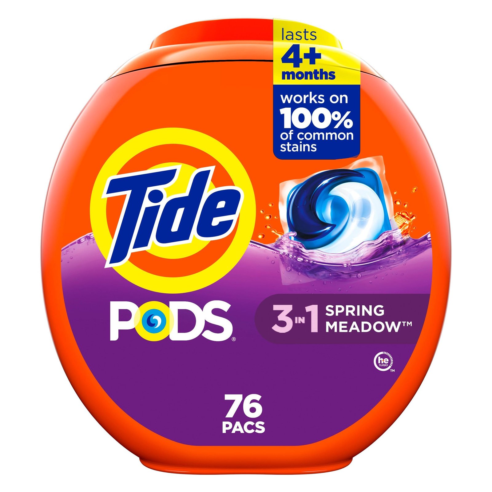 Details: Discover the effortless, powerful clean of Tide PODS laundry detergent pacs, designed to work on 100% of common stains, even in cold water. With a 3-in-1 concentrated formula that combines stain removers, odor fighters, and color protectors, you get exceptional cleaning performance in just one simple step. Tide PODS laundry soap dissolves quickly, activating stain removal and odor fighting in any wash temperature. Say goodbye to grease stains and hello to fresh, vibrant laundry with America’s #1 trusted laundry brand*. Don’t pay for water, pay for clean. Tide PODS laundry soap is concentrated with 3X cleaning ingredients per dose compared to leading bargain liquid detergent, ensuring you get the most out of every load. Just toss Tide PODS laundry soap into the drum before adding clothes, it’s that easy! For larger or heavily soiled loads, simply add another Tide POD. Transform your laundry routine with the long-lasting, springtime freshness of Tide Spring Meadow scent. Get the clean you love, effortlessly in 1 wash with Tide PODS, your 3-in-1 laundry solution. Experience the power of Tide today! Please keep Tide PODS stored out of reach of children and pets. *Voted most trusted laundry brand by American shoppers based on the 2025 BrandSpark American trust survey.
