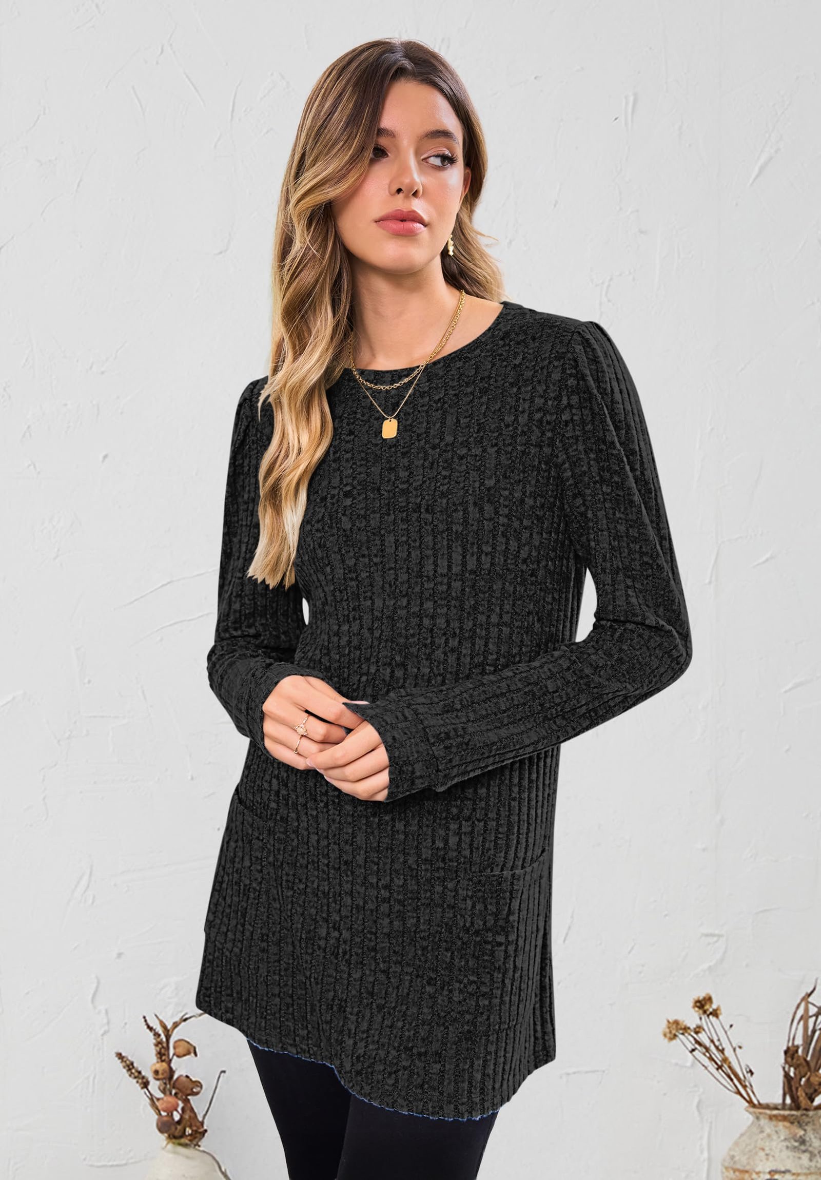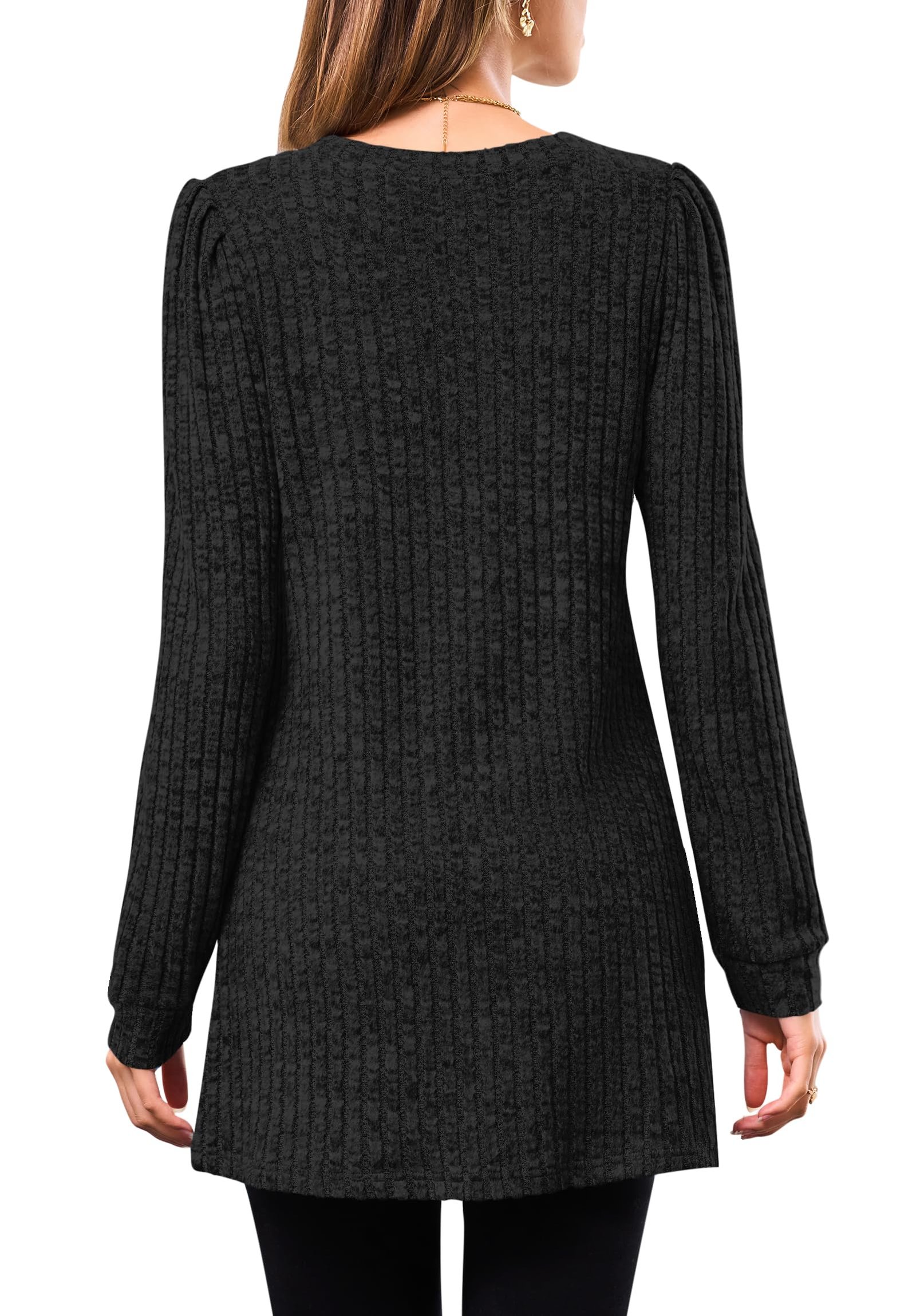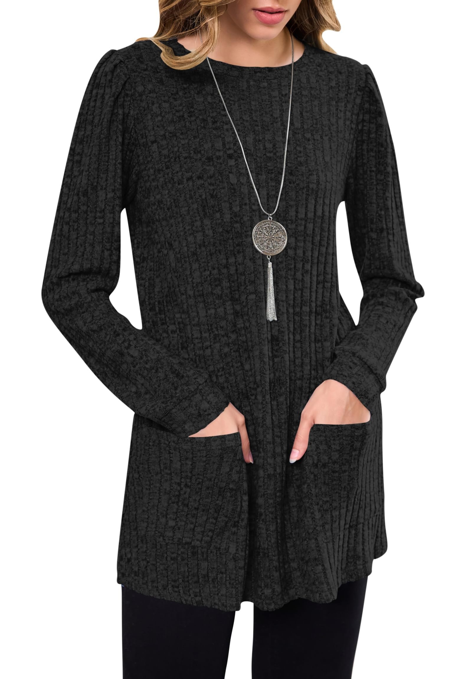 Review WNEEDU Long Sleeve Shirts for Women Long Tunic Tops with Legging Light Sweaters Dress with Pockets 2025 Black XL.