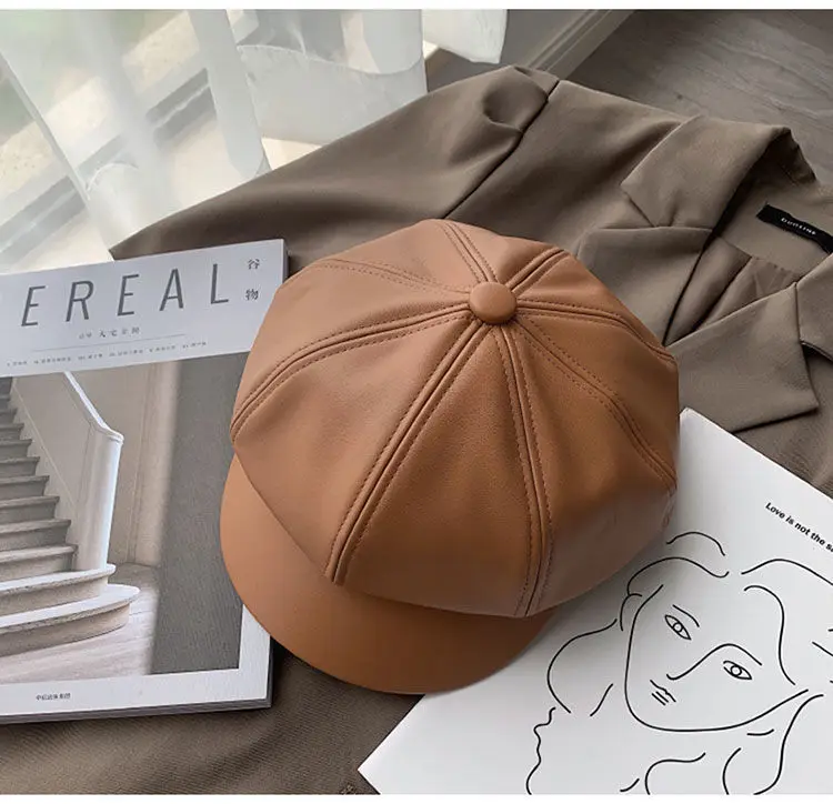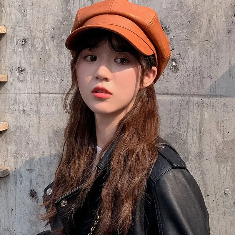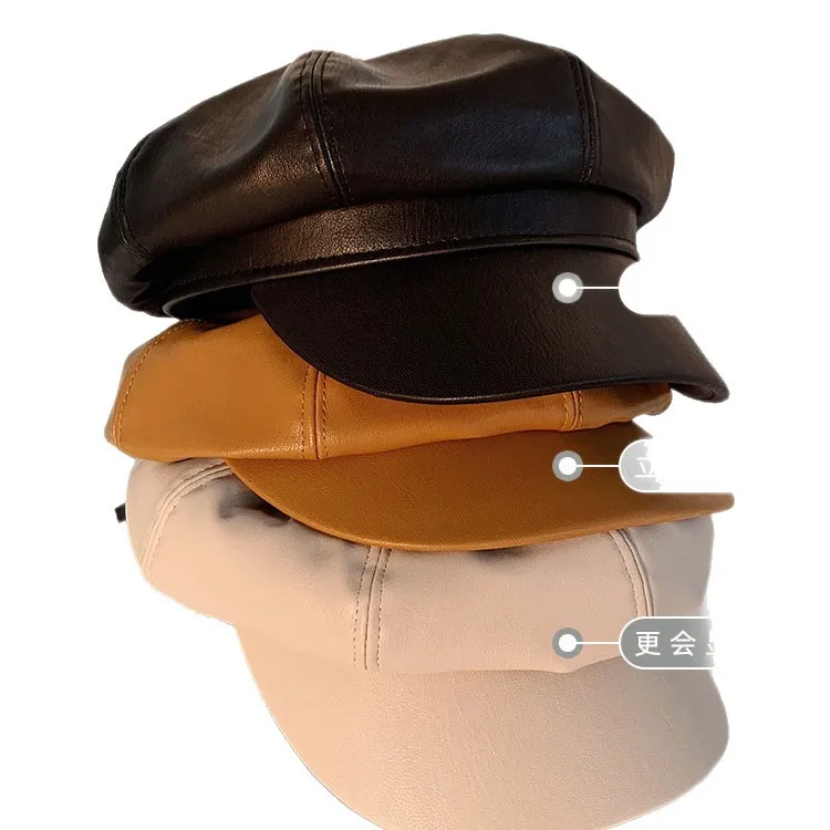 Womens Winter PU Leather Beret Hat Korean Style Cute Versatile Student British Style Octagonal Pumpkin Cap